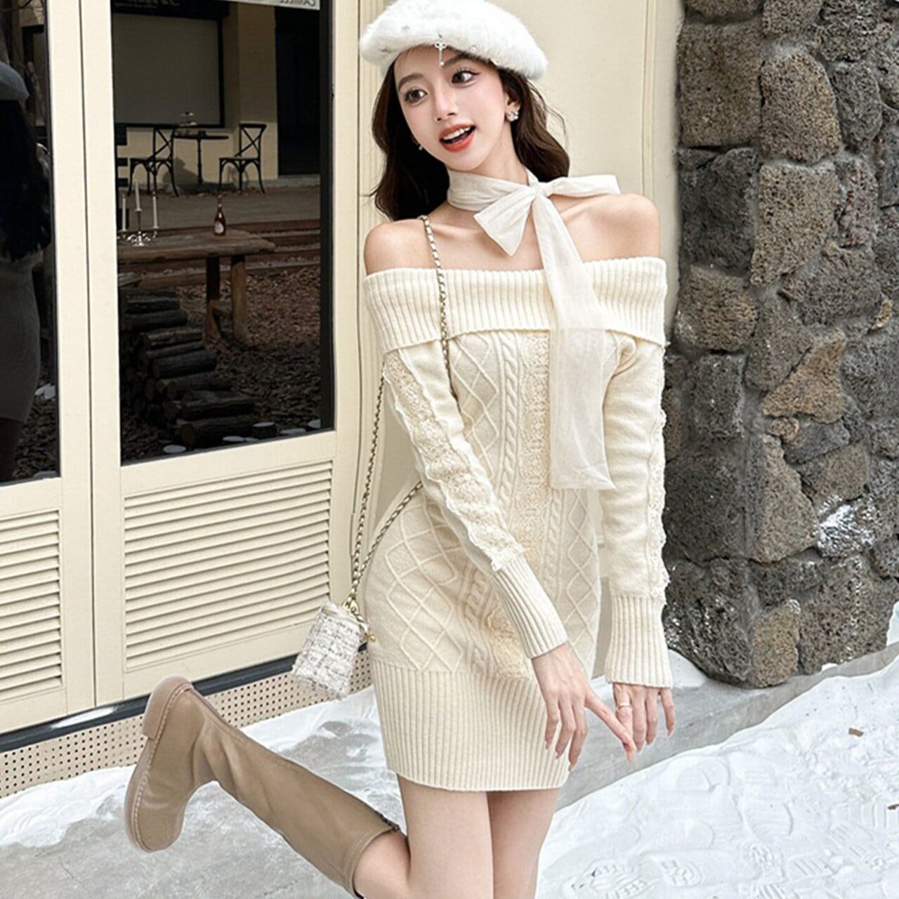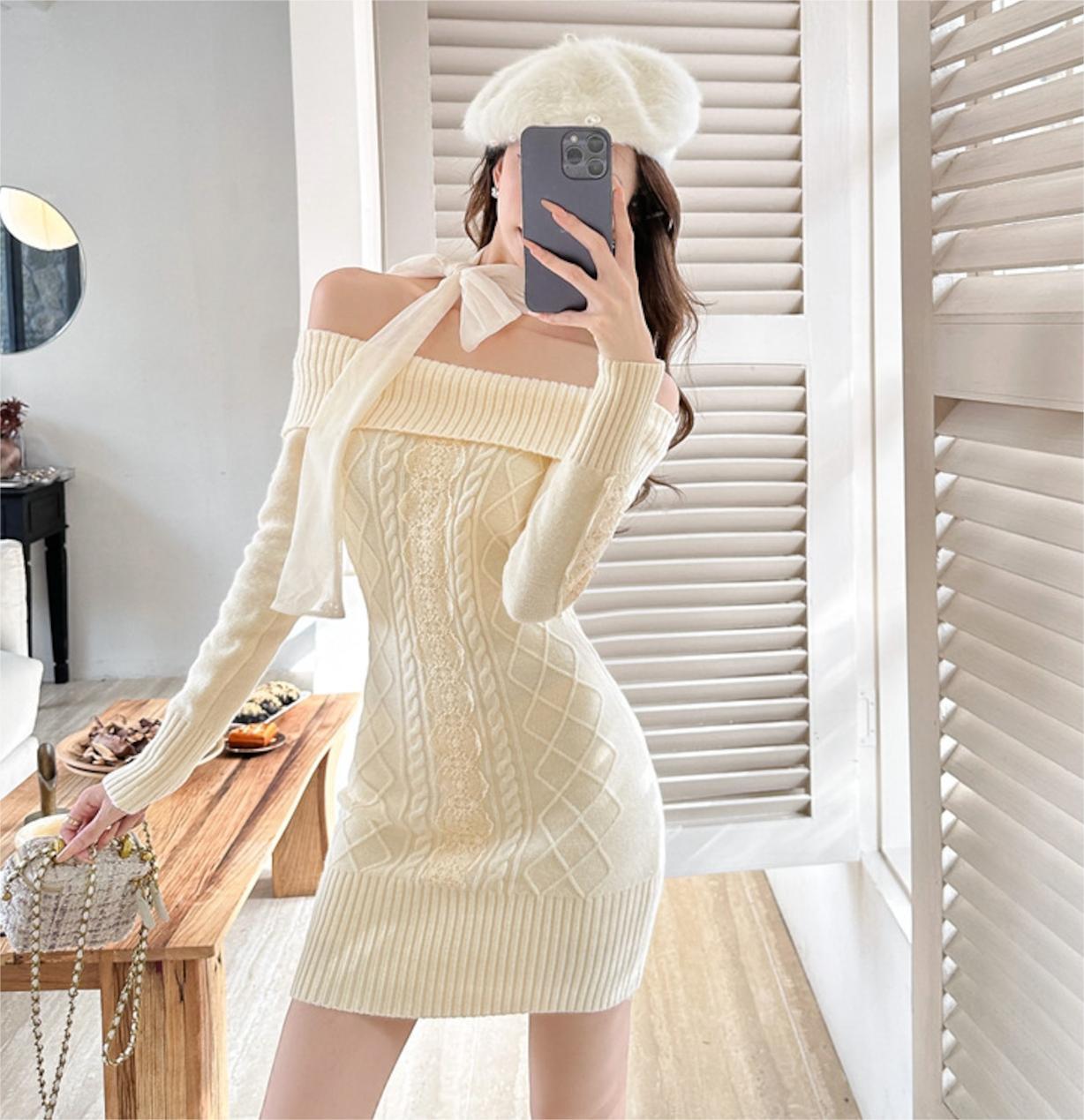 美人度アップ 秋冬服 スウィート エレガント セクシー ファッション 上質 リボンオフショルニットワンピース3色GF8855