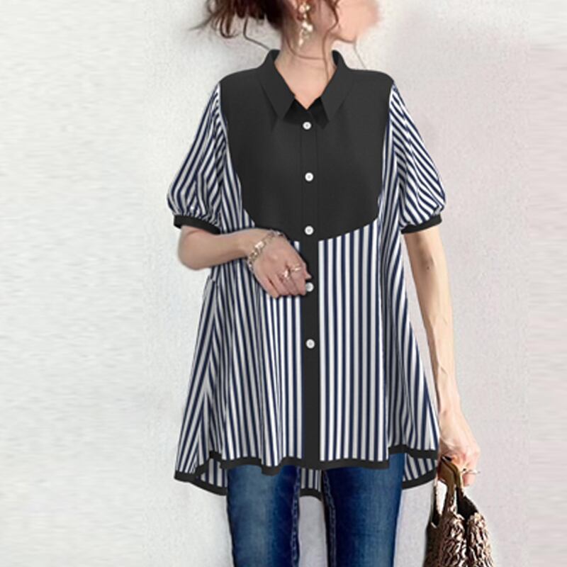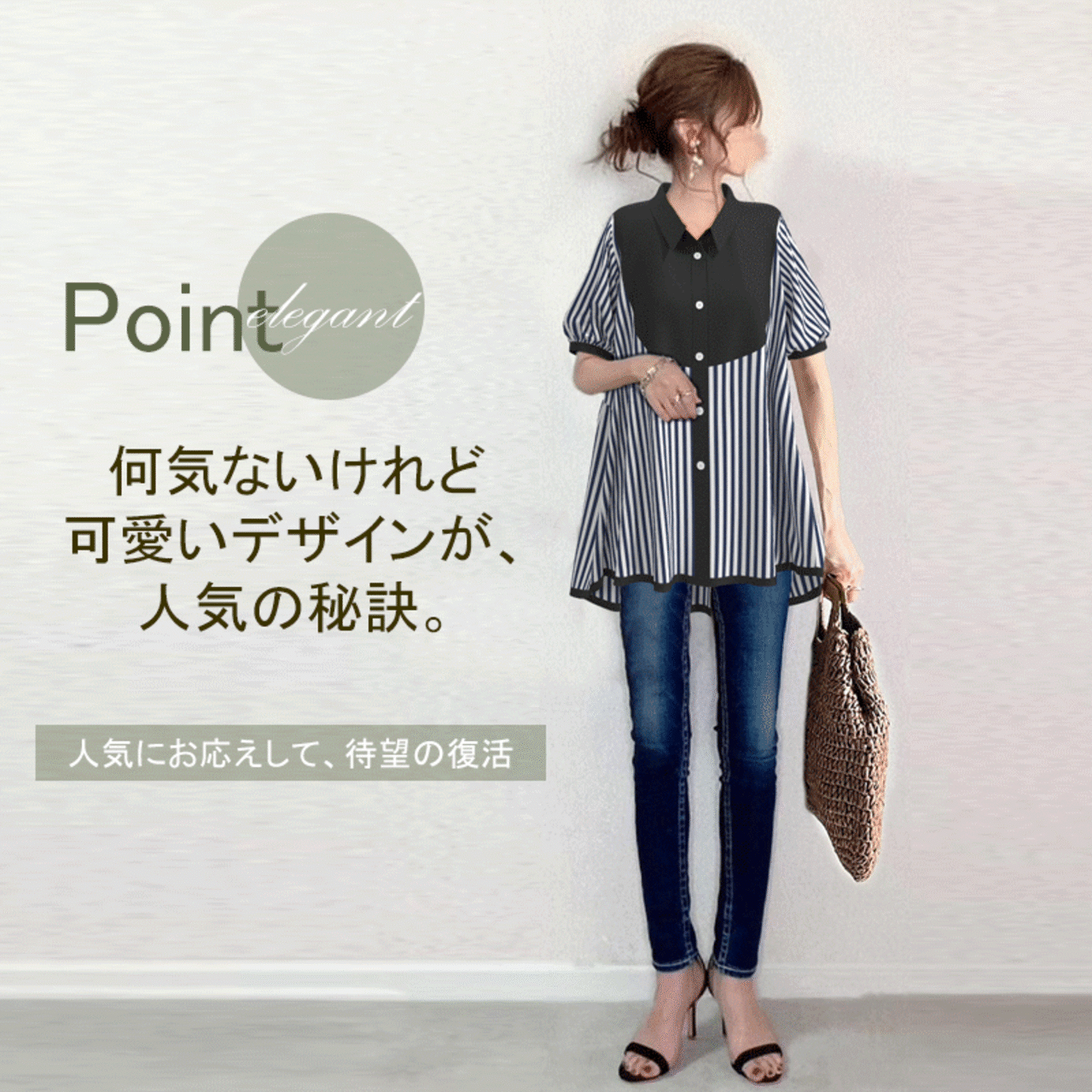 人気上昇中 カジュアル ボタン ストライプ柄 配色 ランタンスリーブ 折り襟 ブラウス 大人カジュアル fashion ootd 夏コーデ ファッション coordinateコーディネート 夏服 カジュアルコーデ 今日のコーデ 大人コーデ レディースGF7654