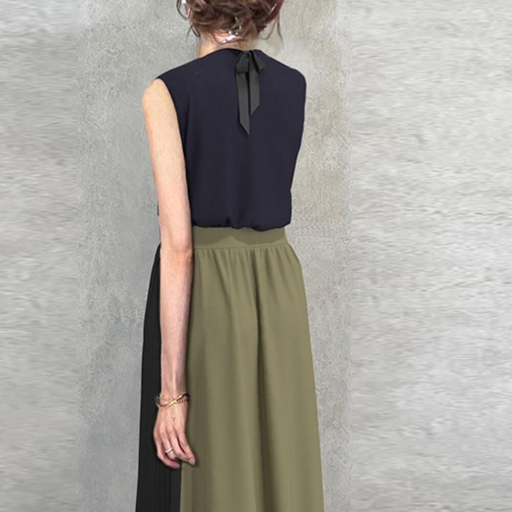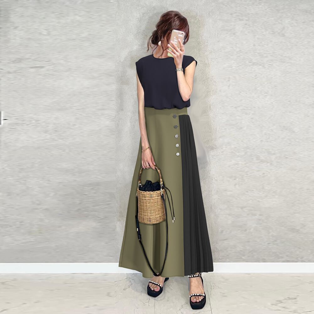 デザイン性抜群 フェミニン ノースリーブ 無地 Tシャツ スカート 配色 プリーツ 2点セット 大人カジュアル fashion ootd 夏コーデ ファッション coordinateコーディネート 夏服 カジュアルコーデ 今日のコーデ 大人コーデ レディースGF7657