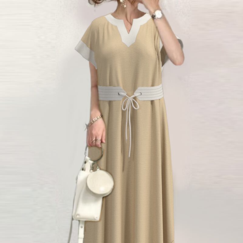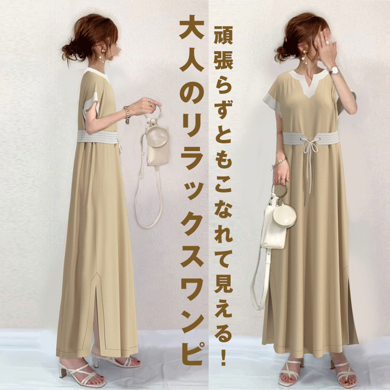 流行の予感 ボウタイ スリット 配色 半袖 Vネック カジュアルワンピース 大人カジュアル fashion ootd 夏コーデ ファッション coordinateコーディネート 夏服 カジュアルコーデ 今日のコーデ 大人コーデ レディースGF7664