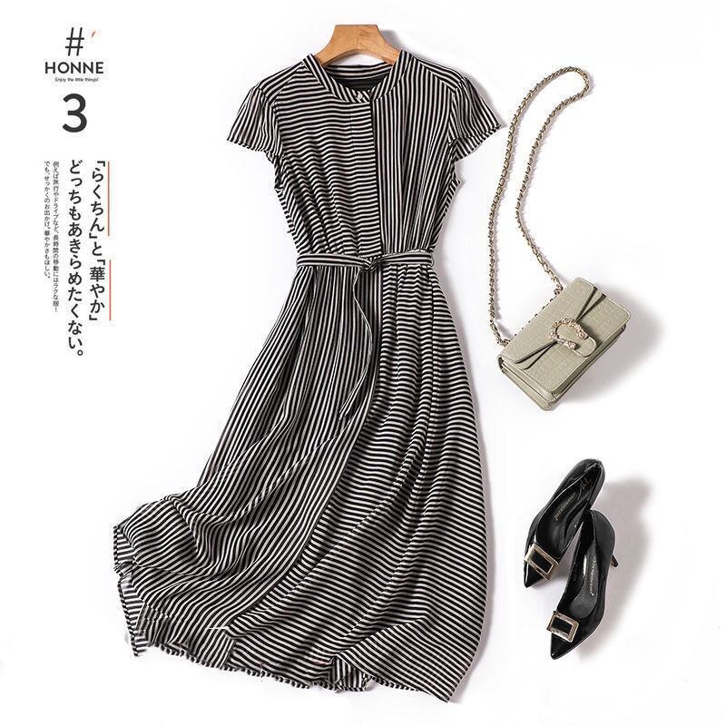 好感度UP 女子会 同窓会 通勤/OL ボーダー ストライプ柄 ボウタイ Aライン エレガント ワンピース 大人カジュアル fashion ootd 夏コーデ ファッション coordinateコーディネート 夏服 カジュアルコーデ 今日のコーデ 大人コーデ レディースGF7736