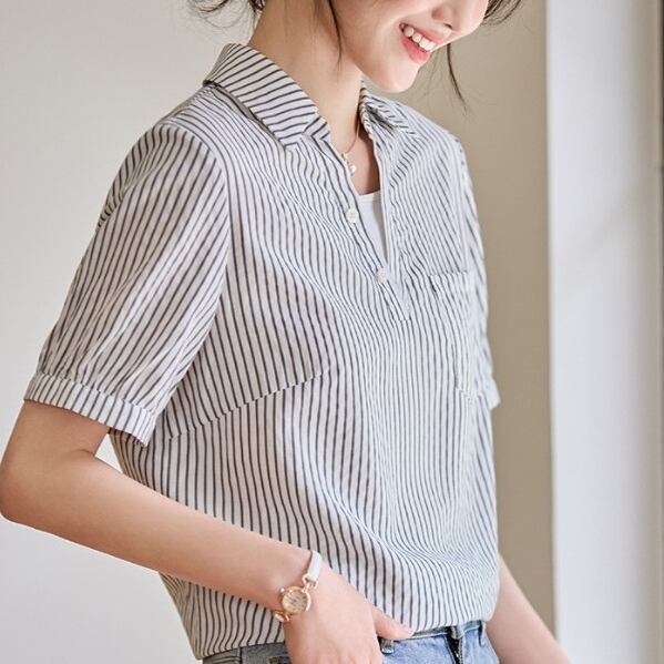 流行の予感 フェミニン ストライプ柄 プルオーバー 半袖 ブラウス 大人カジュアル fashion ootd 夏コーデ ファッション coordinateコーディネート 夏服 カジュアルコーデ 今日のコーデ 大人コーデ レディースGF7771