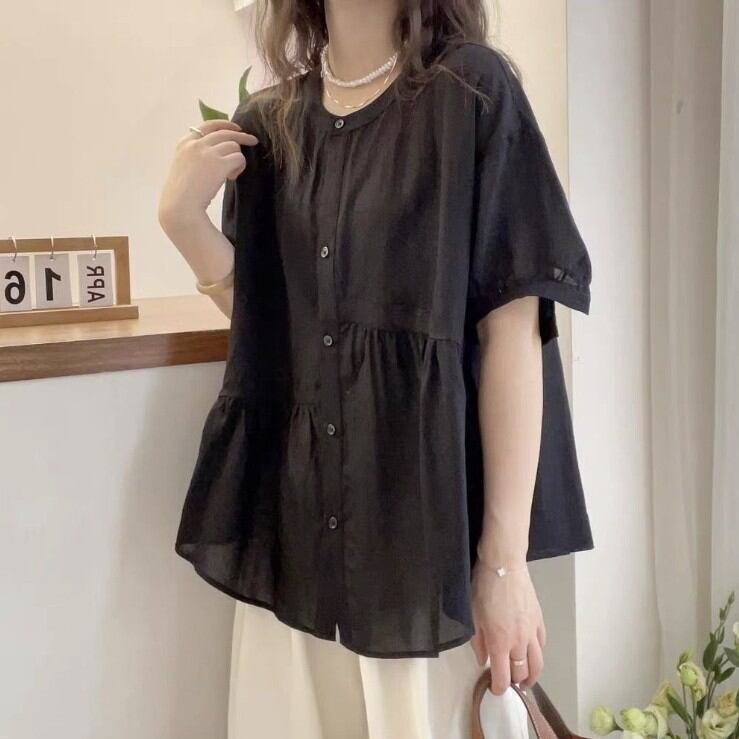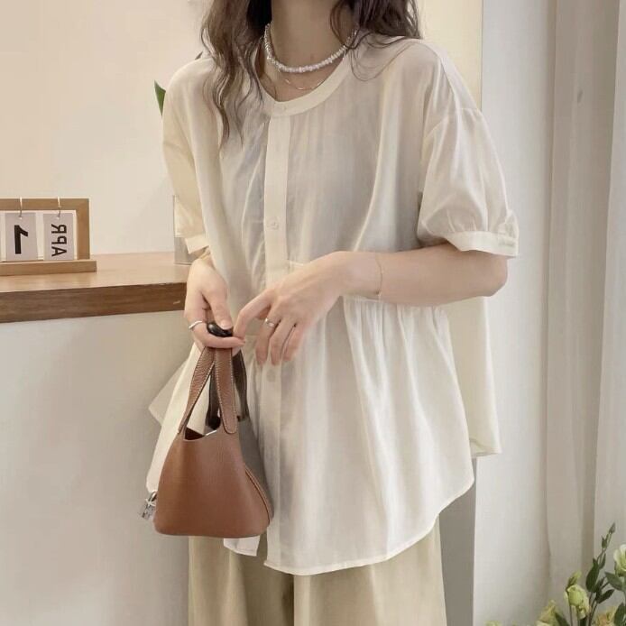 上品なシルエット シンプル 着痩せ 無地 ギャザー 切り替え ラウンドネック ボタン ブラウス 大人カジュアル fashion ootd 夏コーデ ファッション coordinateコーディネート 夏服 カジュアルコーデ 今日のコーデ 大人コーデ レディースGF7813