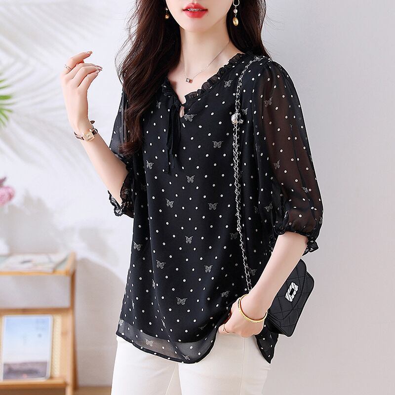 着回し力抜群 接触冷感 プリント 五分袖 ボウタイ シフォンシャツ 大人カジュアル fashion ootd 夏コーデ ファッション coordinateコーディネート 夏服 カジュアルコーデ 今日のコーデ 大人コーデ レディースGF7846