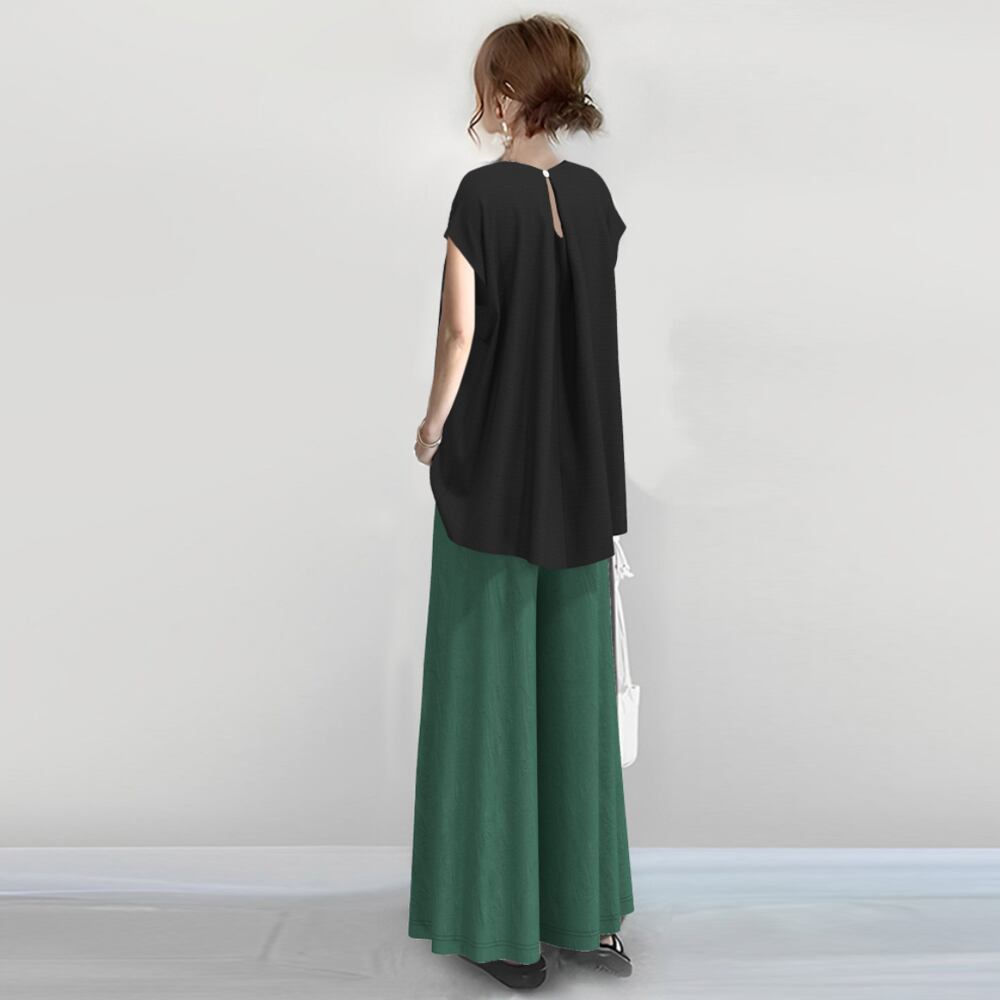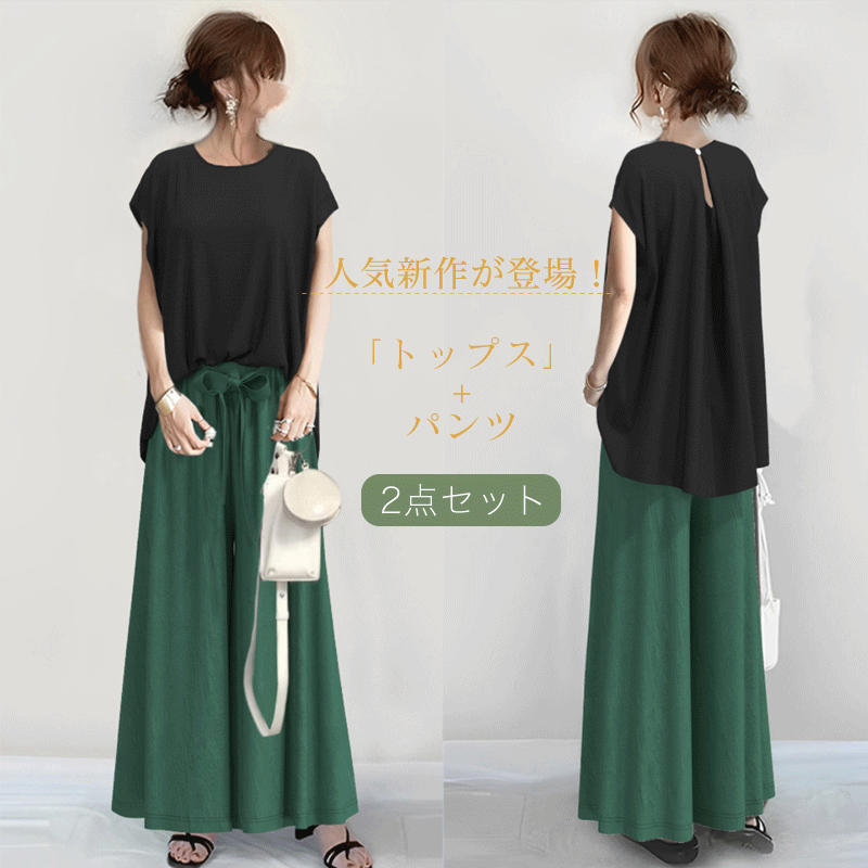 上品なシルエット カジュアル 半袖 ラウンドネック ブラウス ガウチョパンツ 無地 ボウタイ 2点セット 大人カジュアル fashion ootd 夏コーデ ファッション coordinateコーディネート 夏服 カジュアルコーデ 今日のコーデ 大人コーデ レディースGF7954