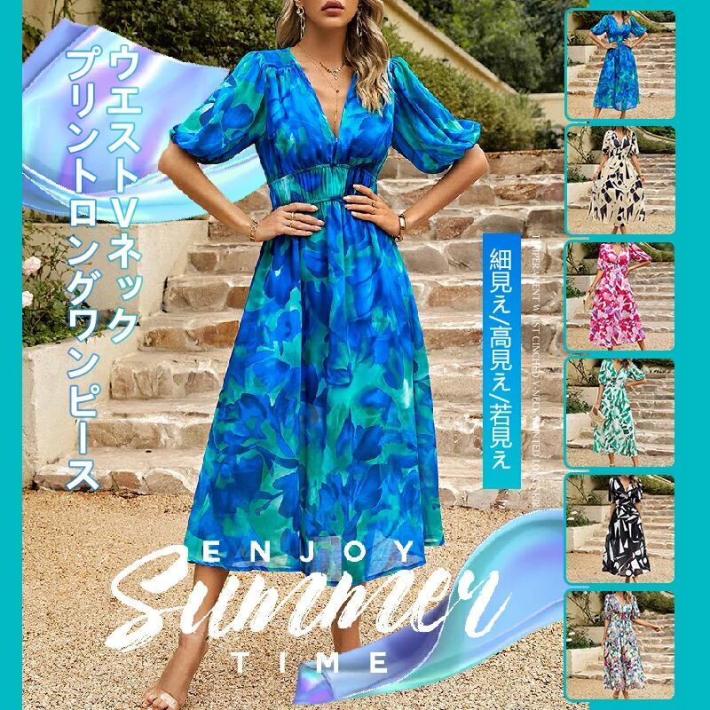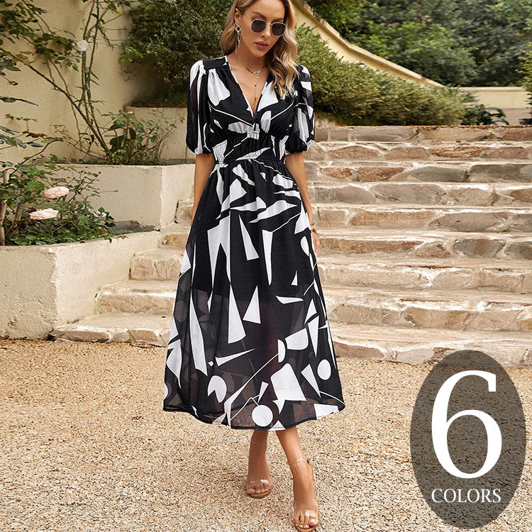 目を奪われる ランタンスリーブ 半袖 エレガント Vネック プリントワンピース 大人カジュアル fashion ootd 夏コーデ ファッション coordinateコーディネート 夏服 カジュアルコーデ 今日のコーデ 大人コーデ レディースGF5184