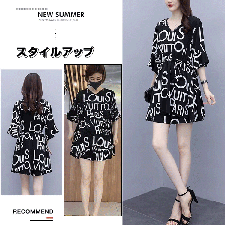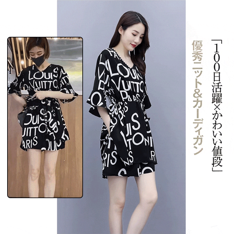 美人度アップ カジュアル 七分袖 Vネック カジュアルワンピース ショートパンツ アルファベット 2点セット 大人カジュアル fashion ootd 夏コーデ ファッション coordinateコーディネート 夏服 カジュアルコーデ 今日のコーデ 大人コーデ レディースGF5186