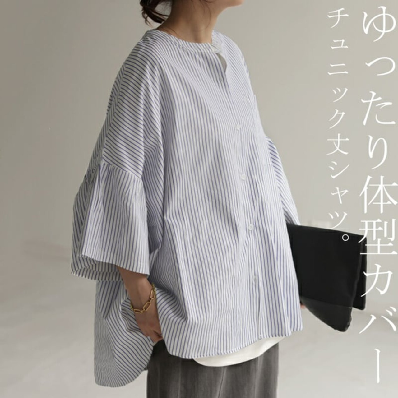Basic日常簡約 カジュアル ストライプ柄 ボタン 五分袖 フレア袖 シャツ 大人カジュアル fashion ootd 夏コーデ ファッション coordinateコーディネート 夏服 カジュアルコーデ 今日のコーデ 大人コーデ レディースGF8130