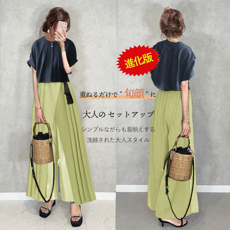 スタイリッシュ フェミニン 半袖 ラウンドネック ブラウス ガウチョパンツ 配色 プリーツ 2点セット 大人カジュアル fashion ootd 夏コーデ ファッション coordinateコーディネート 夏服 カジュアルコーデ 今日のコーデ 大人コーデ レディースGF4670