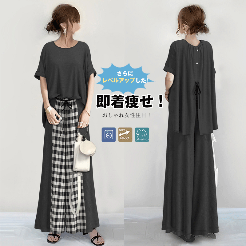 組み合わせ自由 定番 半袖 ボウタイ Tシャツ ガウチョパンツ チェック柄 切り替え 2点セット 大人カジュアル fashion ootd 夏コーデ ファッション coordinateコーディネート 夏服 カジュアルコーデ 今日のコーデ 大人コーデ レディースGF5392