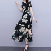 高見えデザイン フェミニン Aライン ハイウエスト 半袖 配色 着痩せ効果 プリントワンピース 大人カジュアル fashion ootd 夏コーデ ファッション coordinateコーディネート 夏服 カジュアルコーデ 今日のコーデ 大人コーデ レディースGF5497
