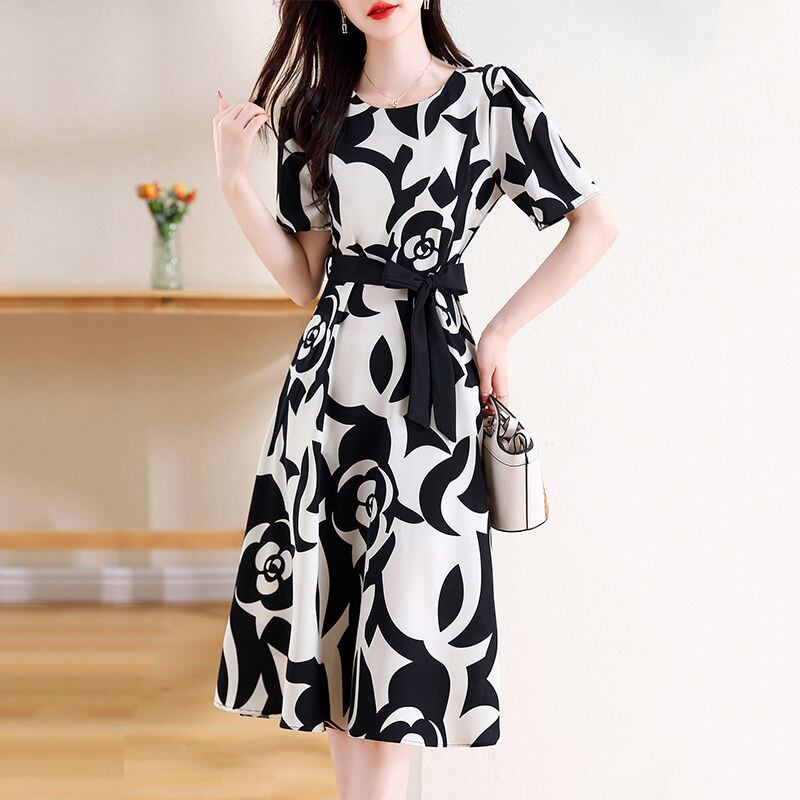 高見えデザイン ボウタイ ハイウエスト ラウンドネック フェミニン 半袖 Aライン プリントワンピース 大人カジュアル fashion ootd 夏コーデ ファッション coordinateコーディネート 夏服 カジュアルコーデ 今日のコーデ 大人コーデ レディースGF4831