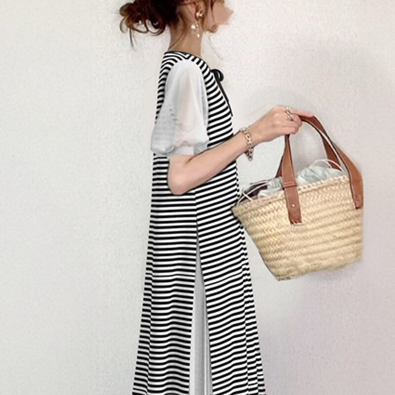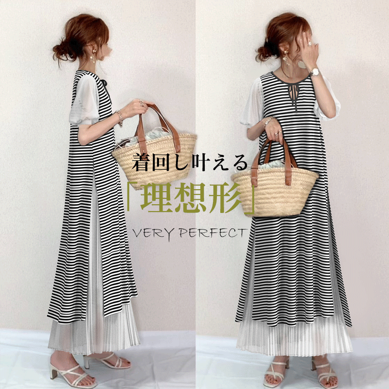 主役級 ランタンスリーブ レイヤード / 重ね着風 半袖 ラウンドネック スリット 切り替え ボウタイ 透かし編み ボーダー 配色 カジュアルワンピース 大人カジュアル fashion ootd 夏コーデ ファッション coordinateコーディネート 夏服 カジュアルコーデ 今日のコーデ 大人コーデ レディースGF4994