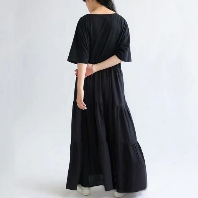 早い者勝ち カジュアル 無地 ブラック ロング ラウンドネック ワンピース 大人カジュアル fashion ootd 夏コーデ ファッション coordinateコーディネート 夏服 カジュアルコーデ 今日のコーデ 大人コーデ レディースGF5534