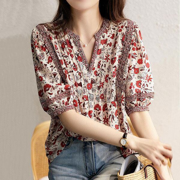 早い者勝ち ファッション プリント プルオーバー Vネック ブラウス 大人カジュアル fashion ootd 夏コーデ ファッション coordinateコーディネート 夏服 カジュアルコーデ 今日のコーデ 大人コーデ レディースGF6848