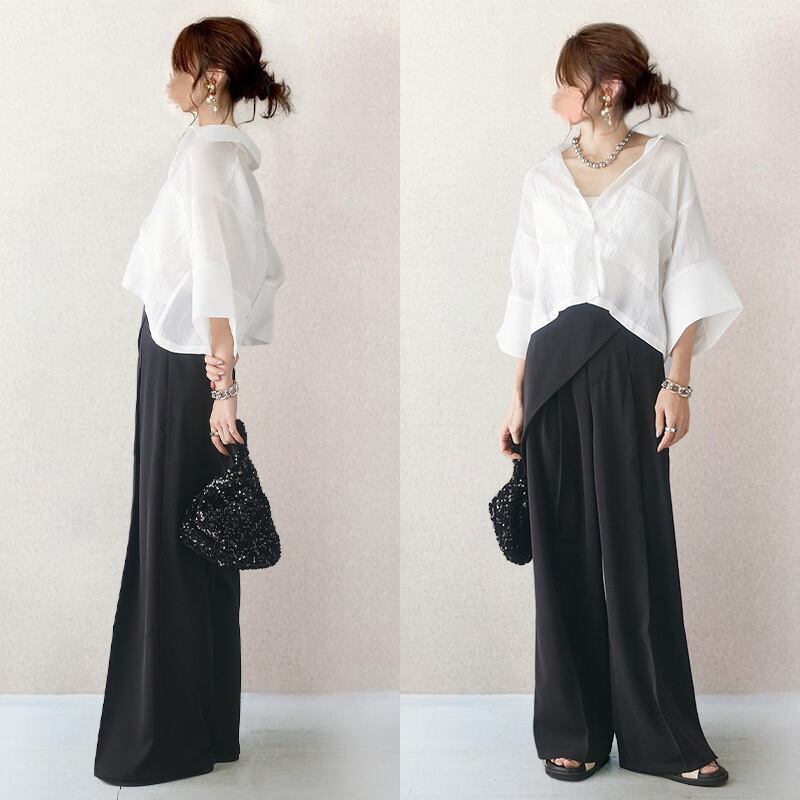 ファッション感満々 エレガント 五分袖 折り襟 Tシャツ ガウチョパンツ 無地 2点セット 大人カジュアル fashion ootd 夏コーデ ファッション coordinateコーディネート 夏服 カジュアルコーデ 今日のコーデ 大人コーデ レディースGF6862