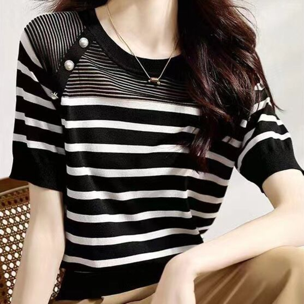早い者勝ち シンプル ボーダー プルオーバー ラウンドネック 半袖 Tシャツ 大人カジュアル fashion ootd 夏コーデ ファッション coordinateコーディネート 夏服 カジュアルコーデ 今日のコーデ 大人コーデ レディースGF6657
