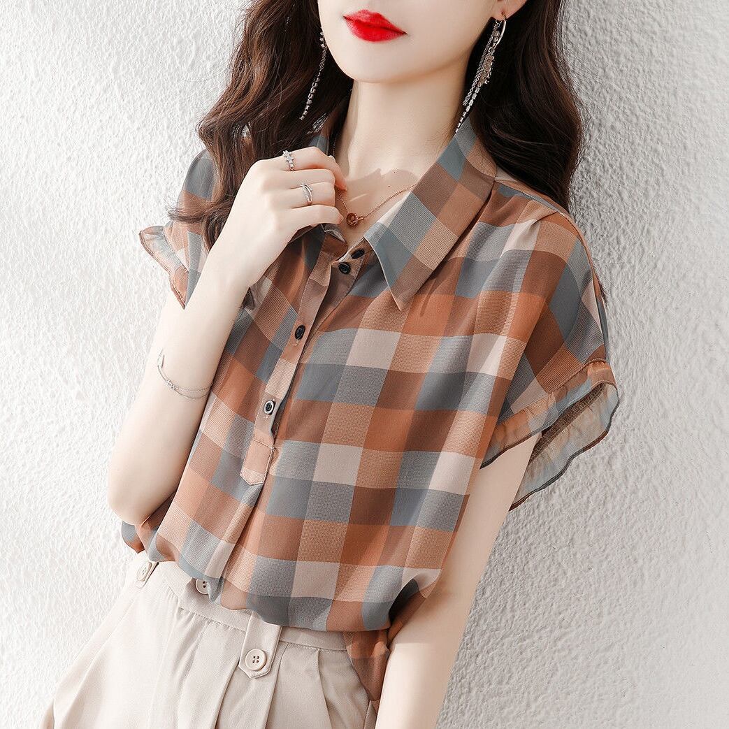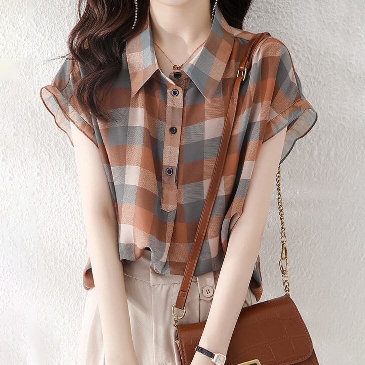 おしゃれ POLOネック 配色 チェック柄 シングルブレスト フリルスリーブ ブラウス 大人カジュアル fashion ootd 夏コーデ ファッション coordinateコーディネート 夏服 カジュアルコーデ 今日のコーデ 大人コーデ レディースGF6990