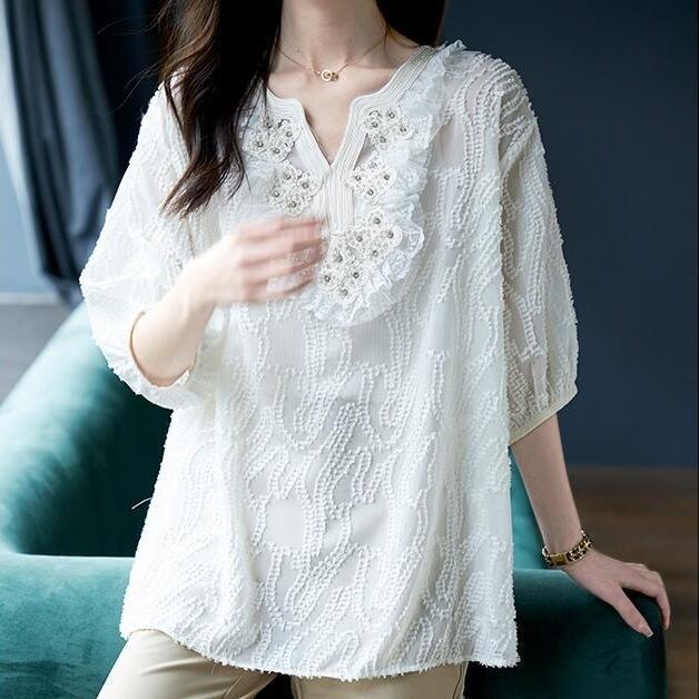 無地 刺繍 透かし編み 切り替え ランタンスリーブ 不規則 体型をカバー シャツ 大人カジュアル fashion ootd 夏コーデ ファッション coordinateコーディネート 夏服 カジュアルコーデ 今日のコーデ 大人コーデ レディースGF6996