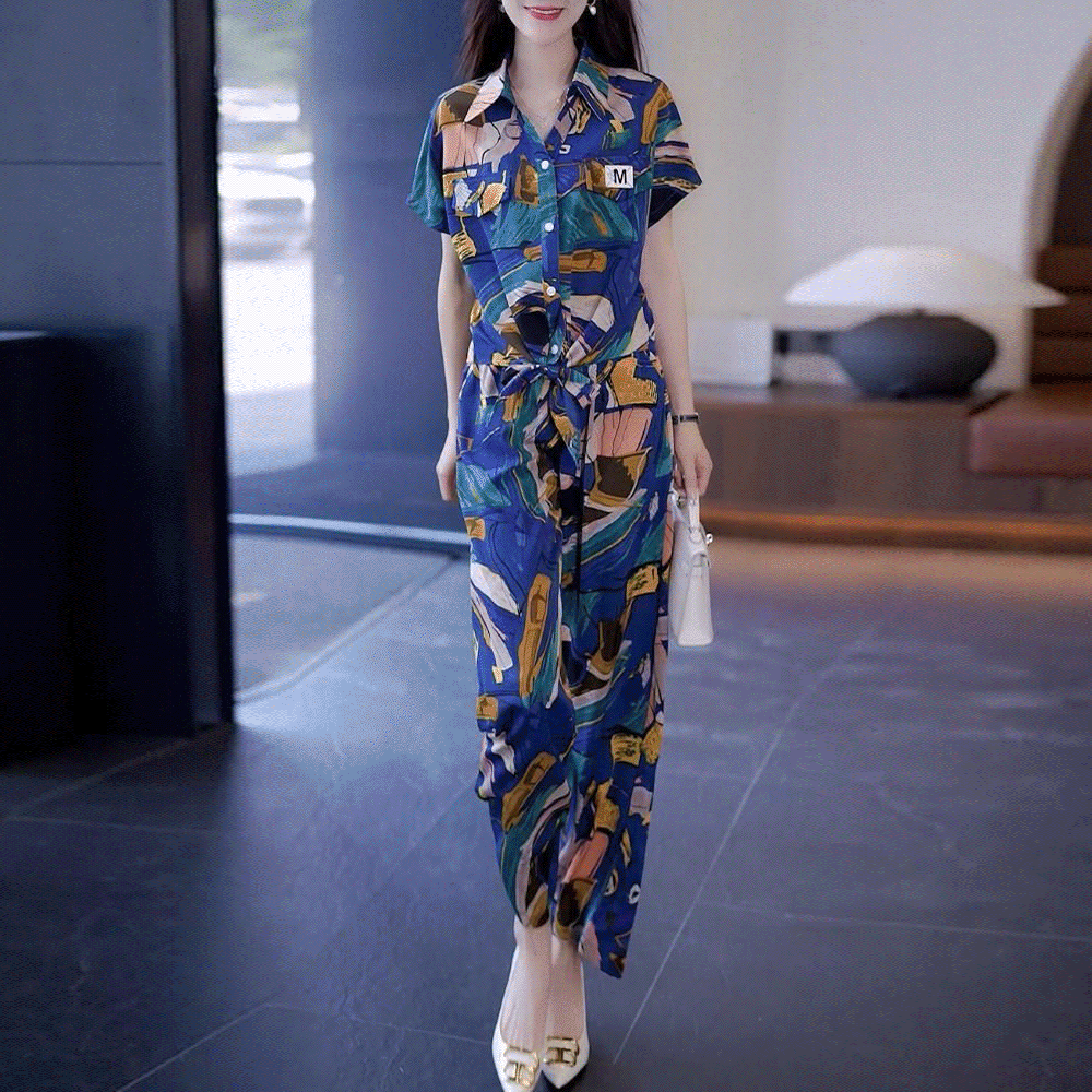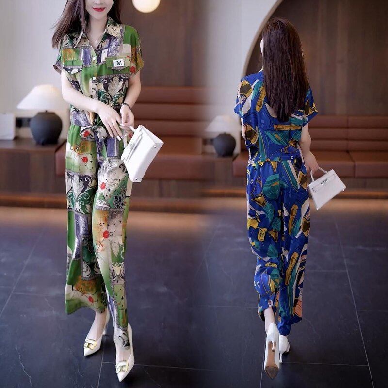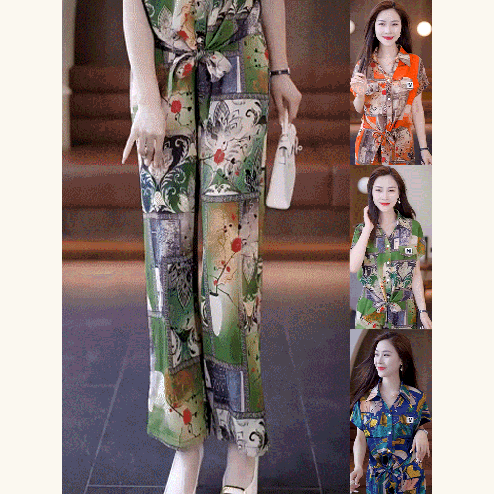 デザイン性抜群 シンプル 半袖 折り襟 ブラウス ガウチョパンツ プリント 2点セット 大人カジュアル fashion ootd 夏コーデ ファッション coordinateコーディネート 夏服 カジュアルコーデ 今日のコーデ 大人コーデ レディースGF7035