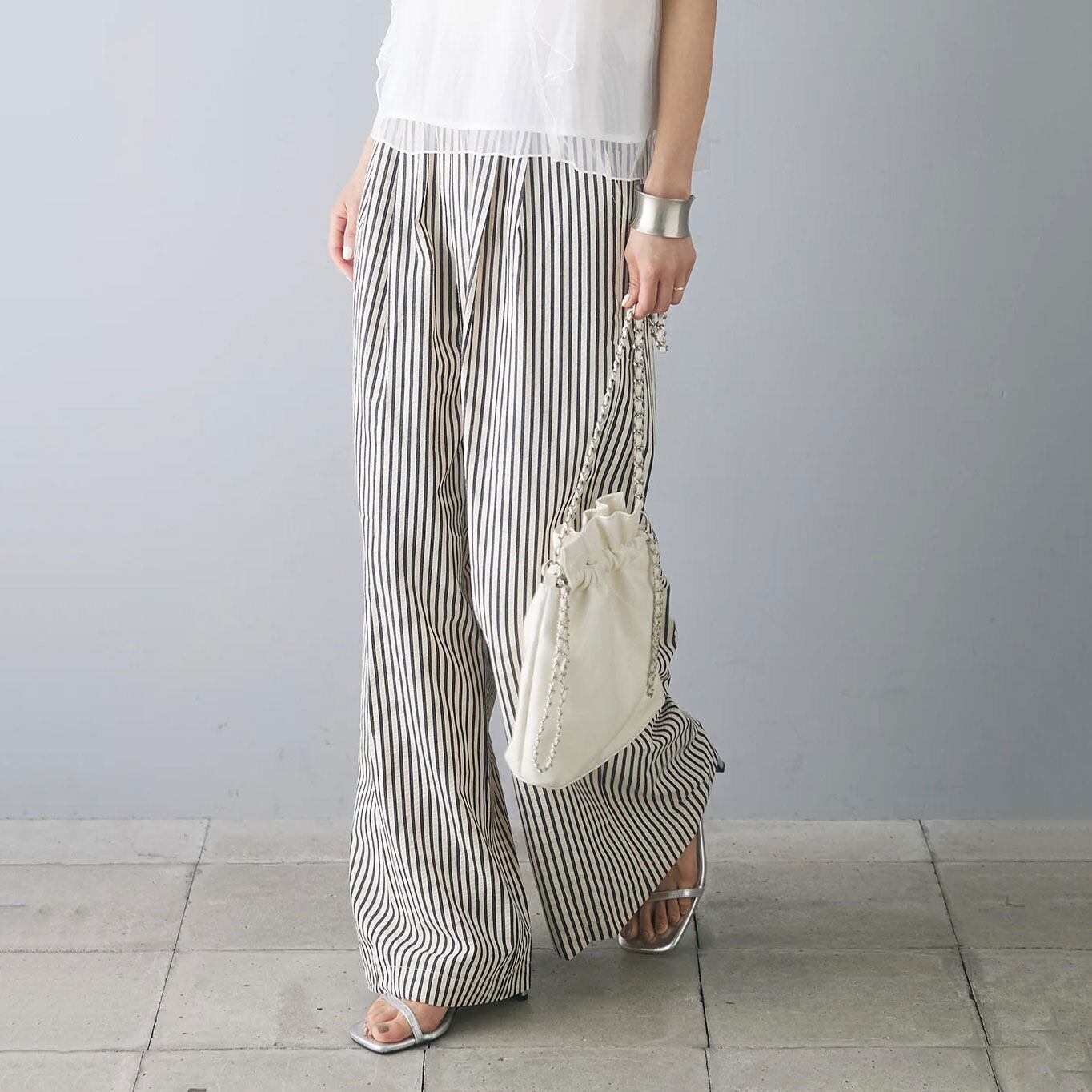 上品なシルエットファッション ストライプ柄 ハイウエスト ギャザー ナチュラル カジュアル ワイドパンツ ガウチョパンツ 大人カジュアル fashion ootd 夏コーデ ファッション coordinateコーディネート 夏服 カジュアルコーデ 今日のコーデ 大人コーデ レディースGF5933