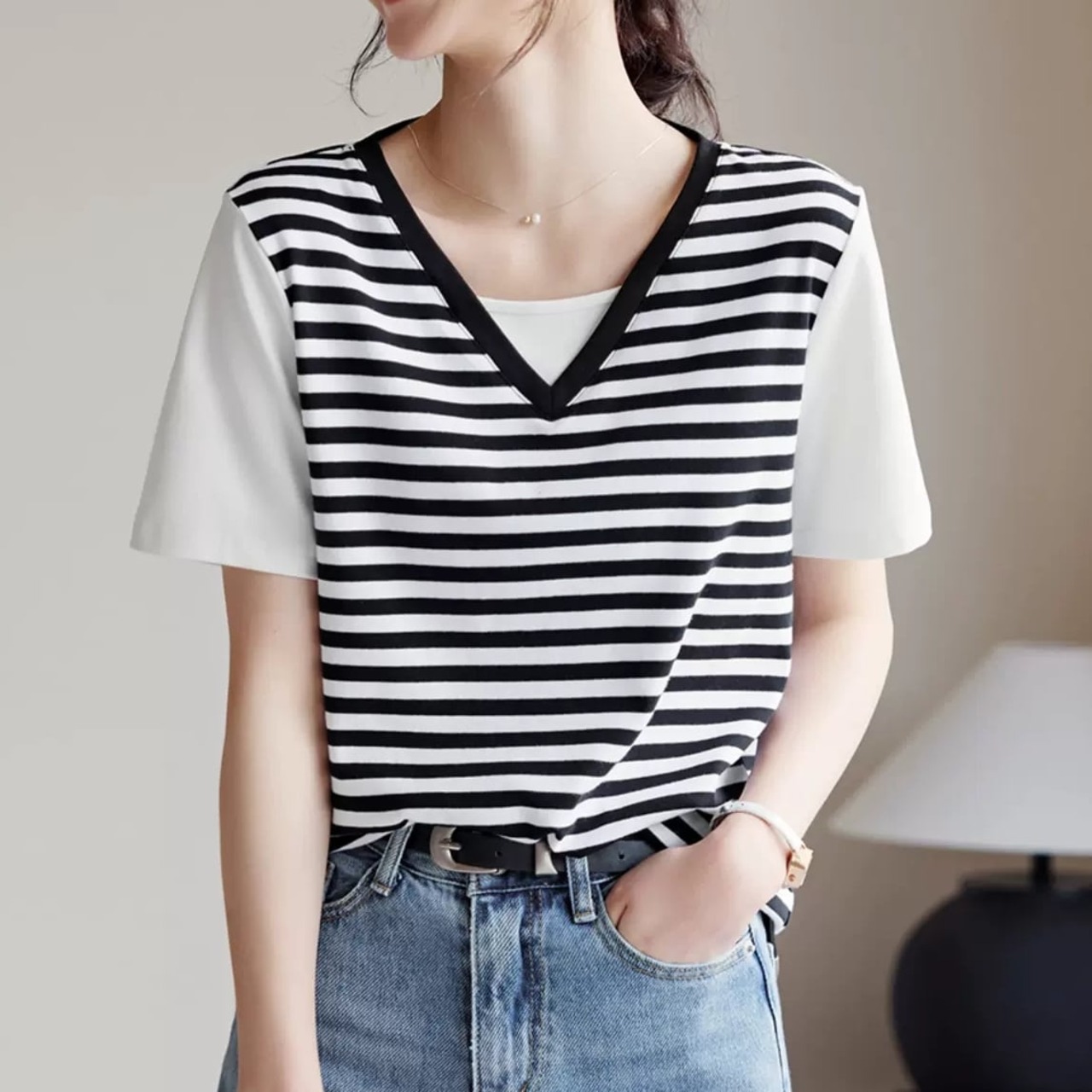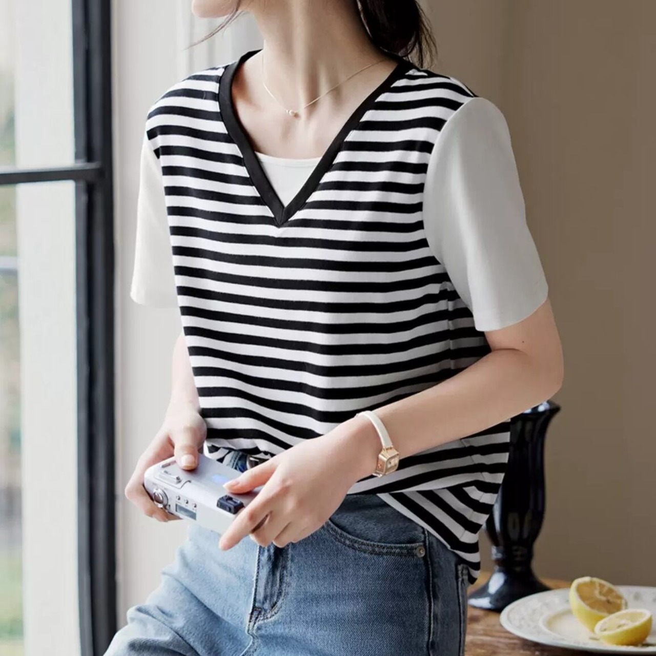 大人可愛い レイヤード カジュアル ボーダー プルオーバー Vネック Tシャツ 大人カジュアル fashion ootd 夏コーデ ファッション coordinateコーディネート 夏服 カジュアルコーデ 今日のコーデ 大人コーデ レディースGF7154