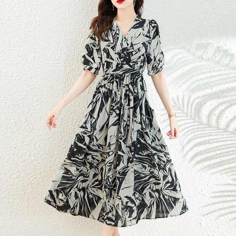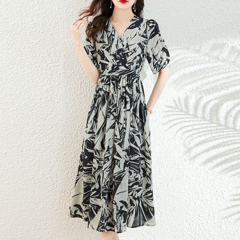 上品さたっぷり ファッション エレガント 半袖 Aライン Vネック ギャザー プリントワンピース 大人カジュアル fashion ootd 夏コーデ ファッション coordinateコーディネート 夏服 カジュアルコーデ 今日のコーデ 大人コーデ レディースGF7159