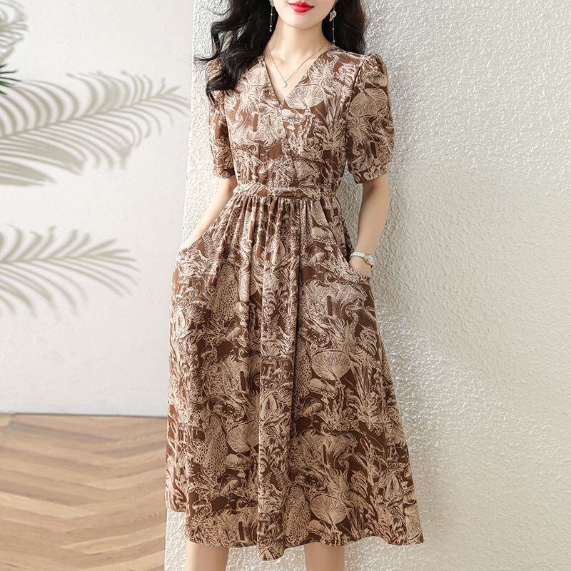 ファッション感満々 フェミニン Vネック Aライン ハイウエスト ギャザー 体型をカバー プリントワンピース 大人カジュアル fashion ootd 夏コーデ ファッション coordinateコーディネート 夏服 カジュアルコーデ 今日のコーデ 大人コーデ レディースGF7161