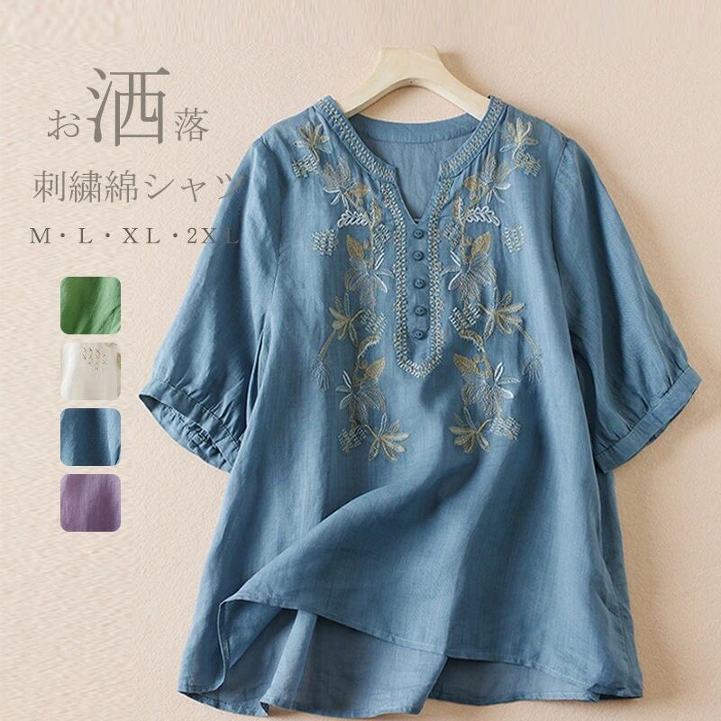 刺繍 切り替え ボタン 花模様 柔軟加工 体型をカバー 半袖 カジュアル 森ガール ボタン シャツ 大人カジュアル fashion ootd 夏コーデ ファッション coordinateコーディネート 夏服 カジュアルコーデ 今日のコーデ 大人コーデ レディースGF7278
