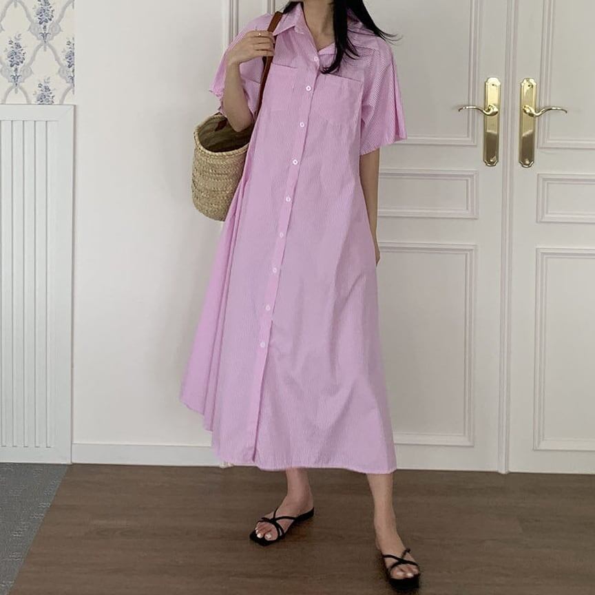 シンプル ルーズ ストライプ柄 ボタン 半袖 ファッション カジュアルワンピース 大人カジュアル fashion ootd 夏コーデ ファッション coordinateコーディネート 夏服 カジュアルコーデ 今日のコーデ 大人コーデ レディースGF6089