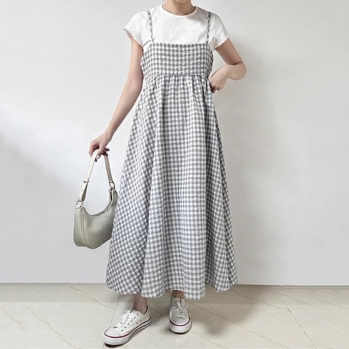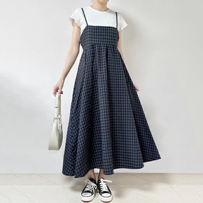 流行の予感 カジュアル ノースリーブ ボウタイ ギャザー ハイウエスト チェック柄 ジャンパースカート 大人カジュアル fashion ootd 夏コーデ ファッション coordinateコーディネート 夏服 カジュアルコーデ 今日のコーデ 大人コーデ レディースGF6153
