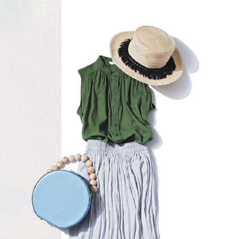 女っぽさが漂う フェミニン ノースリーブ ラウンドネック Tシャツ スカート 無地 ギャザー 2点セット 大人カジュアル fashion ootd 夏コーデ ファッション coordinateコーディネート 夏服 カジュアルコーデ 今日のコーデ 大人コーデ レディースGF6168