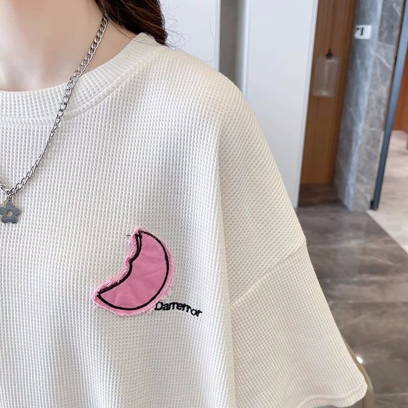 可愛いピンク月柄 Tシャツ 刺入り 丸襟 半袖GF2345