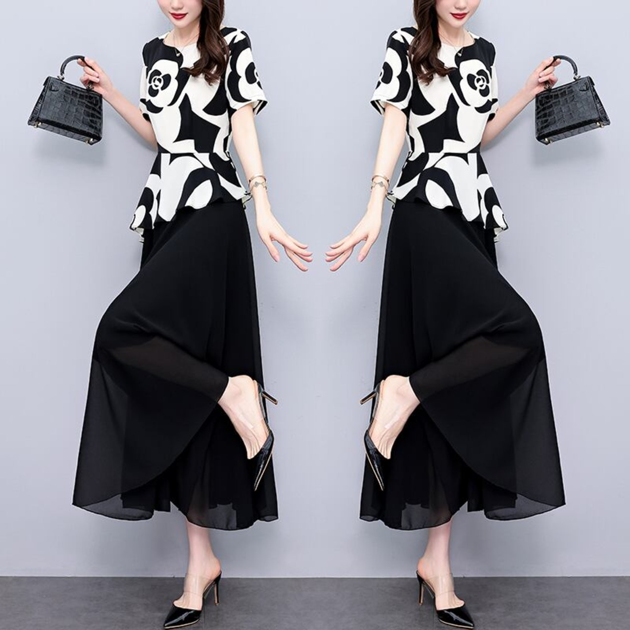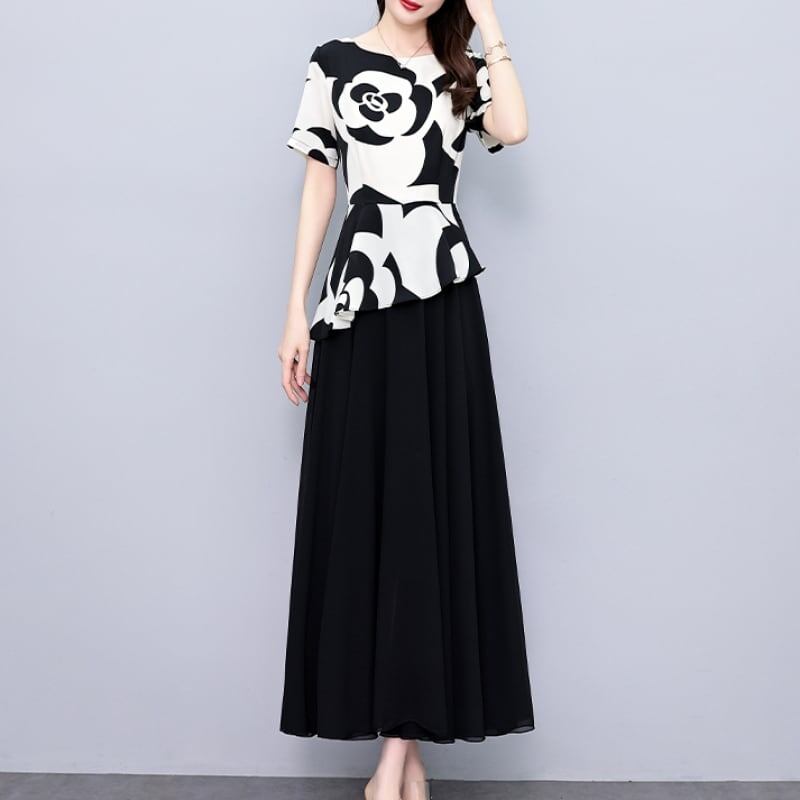 気質アップ フェミニン 半袖 プリント 配色 レイヤード / 重ね着風 Aライン ハイウエスト 切り替え エレガントワンピース 大人カジュアル fashion ootd 夏コーデ ファッション coordinateコーディネート 夏服 カジュアルコーデ 今日のコーデ 大人コーデ レディースGF6190