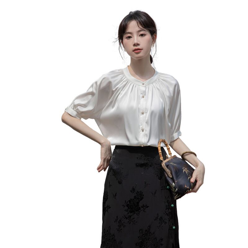 高見えデザイン フェミニン 無地 ラウンドネック シングルブレスト 五分袖 シャツ 大人カジュアル fashion ootd 夏コーデ ファッション coordinateコーディネート 夏服 カジュアルコーデ 今日のコーデ 大人コーデ レディースGF6279