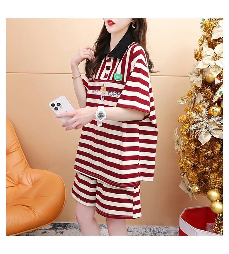 韓国系 POLOネック ストライプ柄 半袖Tシャツⅹショートパンツセットアップ GF2443