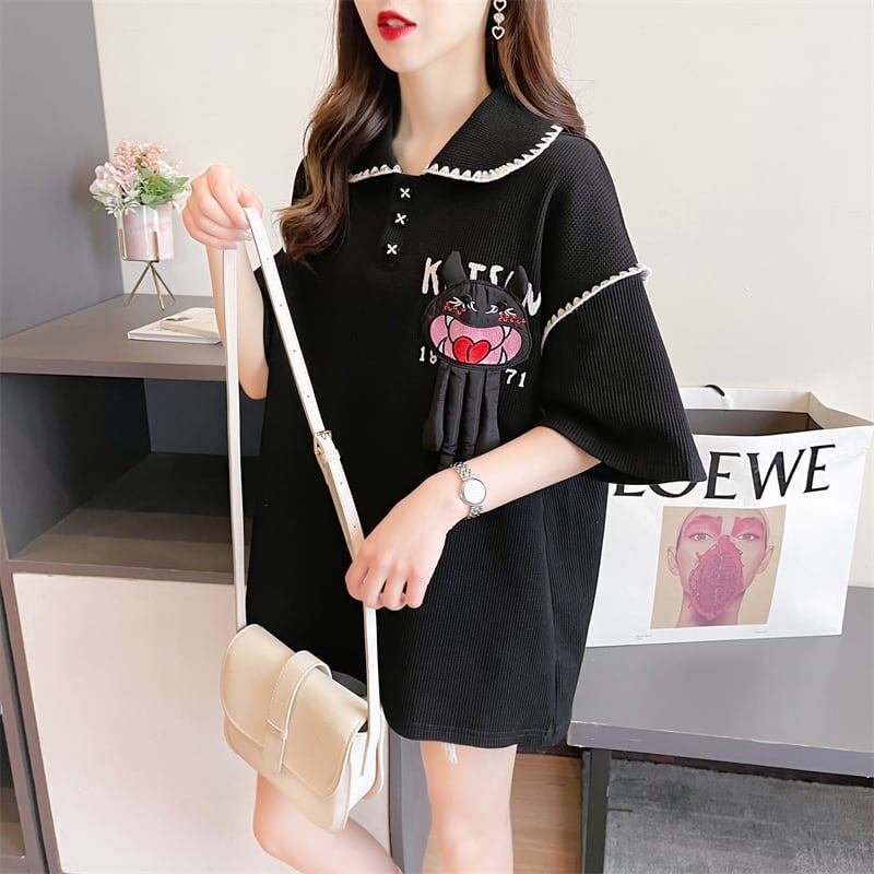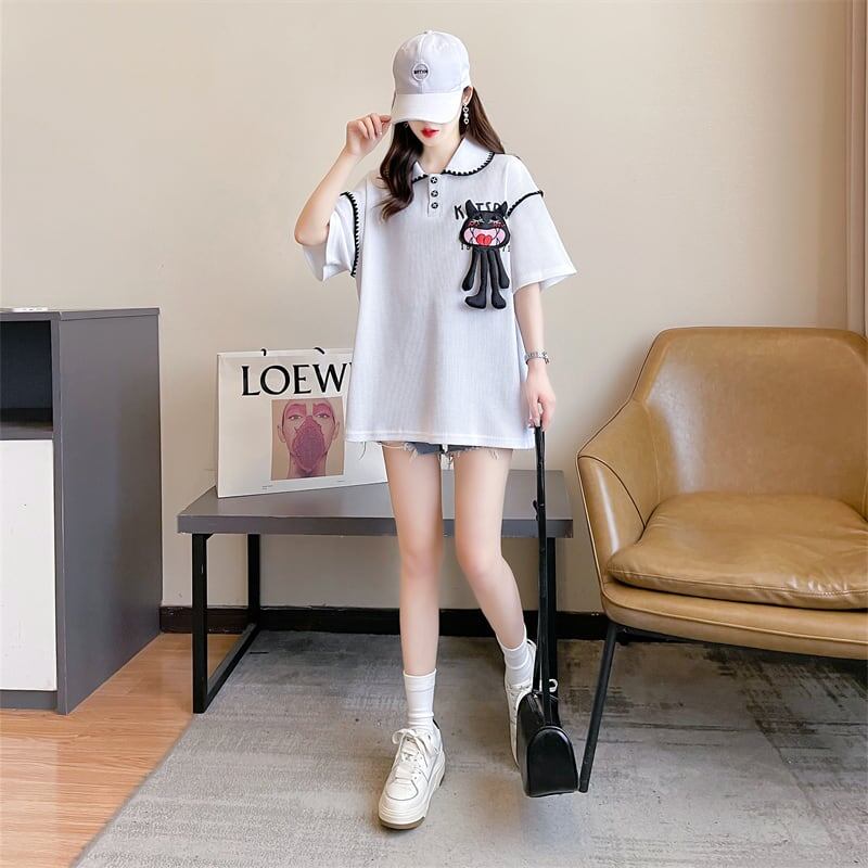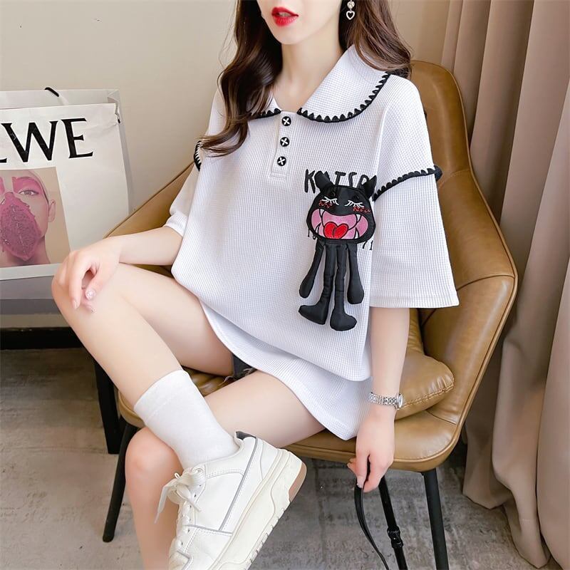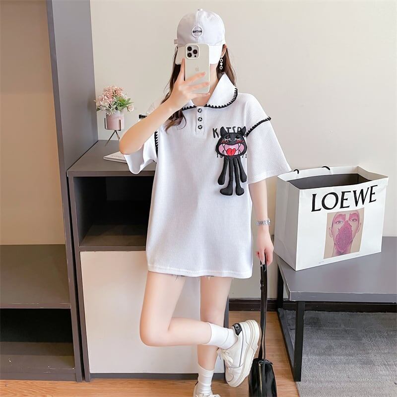 美人度アップ 折り襟 ワッフル ぬいぐるみ付き ロング Tシャツ ゆったり半袖GF2445