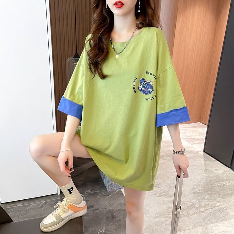 韓国系 ドロップショルダープリント ラウンドネック ロング Tシャツ 三色 ゆったり半袖GF2518