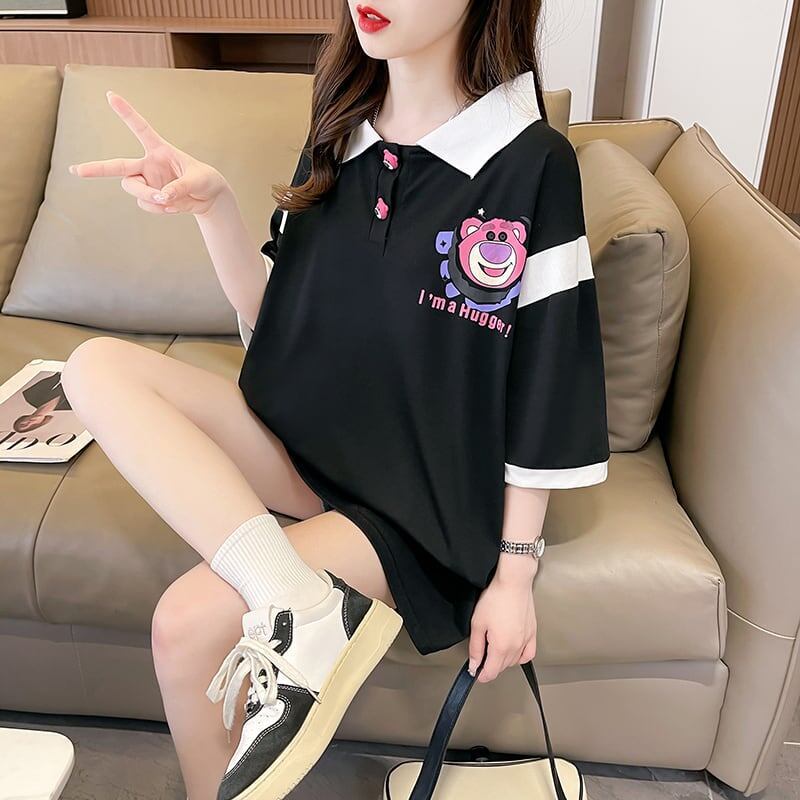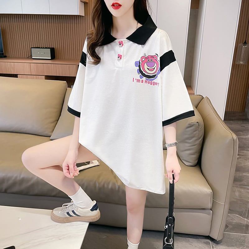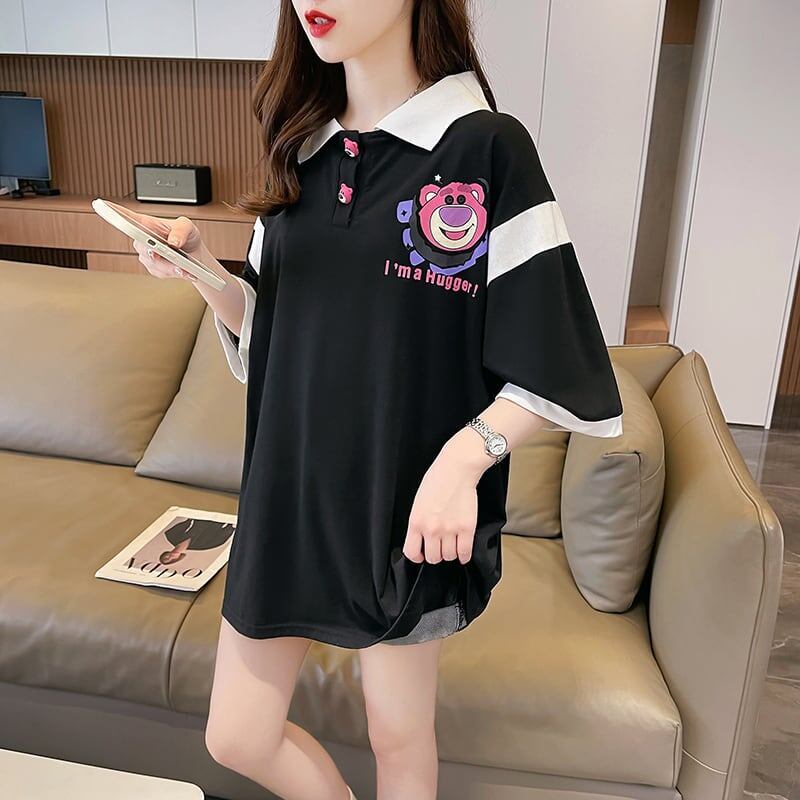 POLOネック 切り替え 熊柄 ロング プリント Tシャツ 二色ゆったりワンピースGF2525