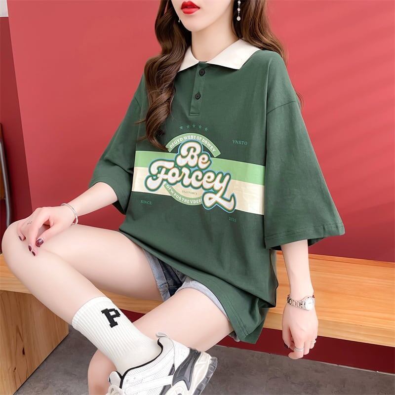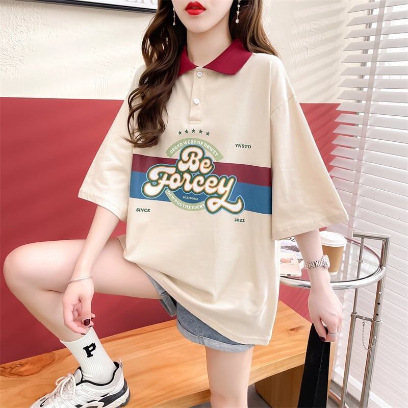 スタイルアップ グラフィック ドロップショルダーTシャツ POLOネック ゆったり半袖 GF2540
