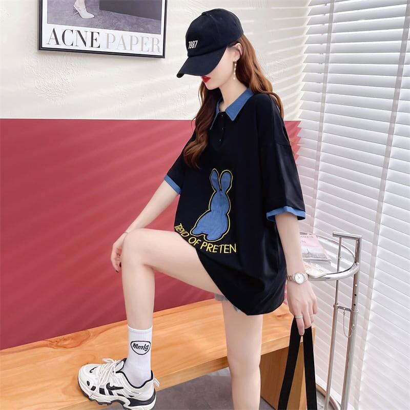 韓国系 プリントTシャツ ウサギちゃん POLOネック 三色 ゆったり半袖 GF2563