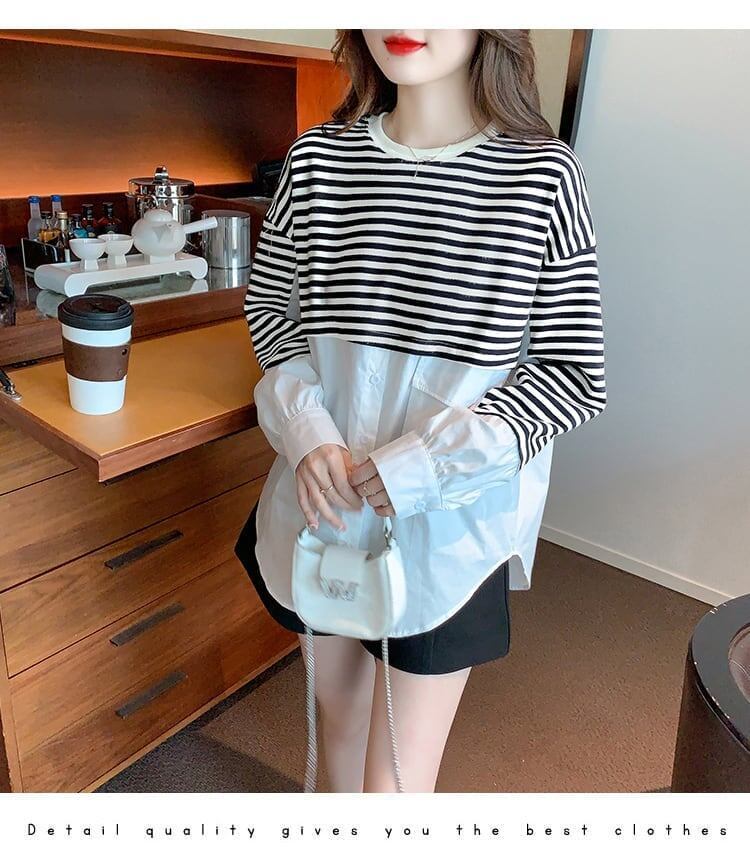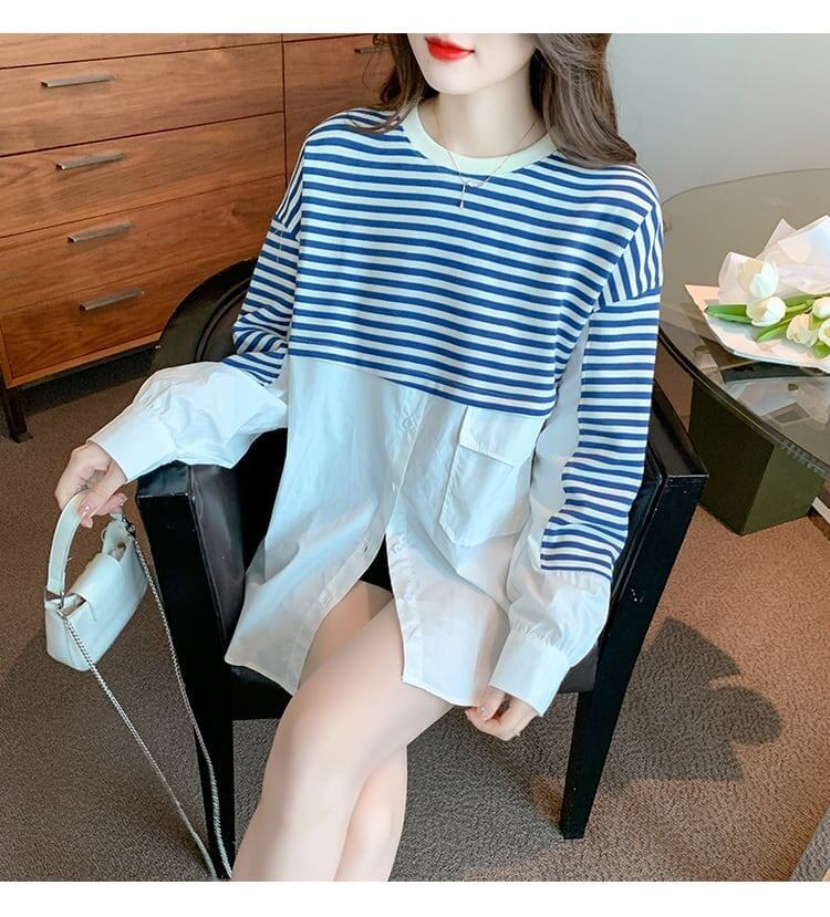 組み合わせやすい ポケット 切り替え ストライプ柄 ロング シャツ ゆったり長袖GF2583