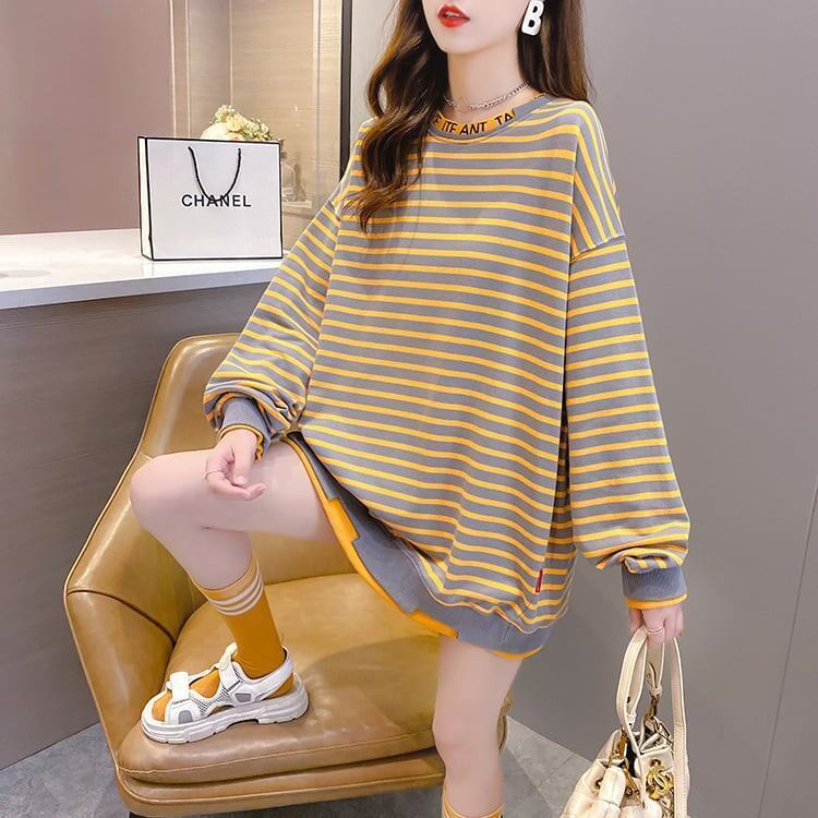 秋の新作 ラウンド ルーズ ネックストライプフェイクツーピース セーターGF2586