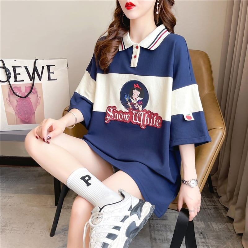 POLOネック 配色 切り替え グラフィック ロング Tシャツ ゆったりワンピースGF2599