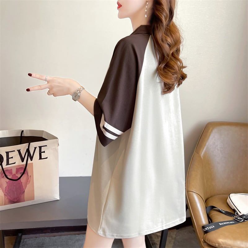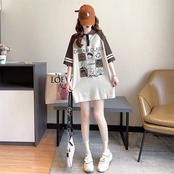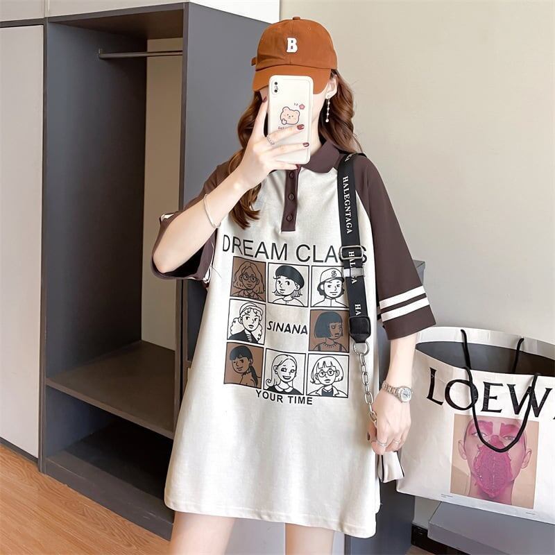 早い者勝ち プリント グラフィック POLOネック ロング ラグランTシャツ ゆったりワンピースGF2600