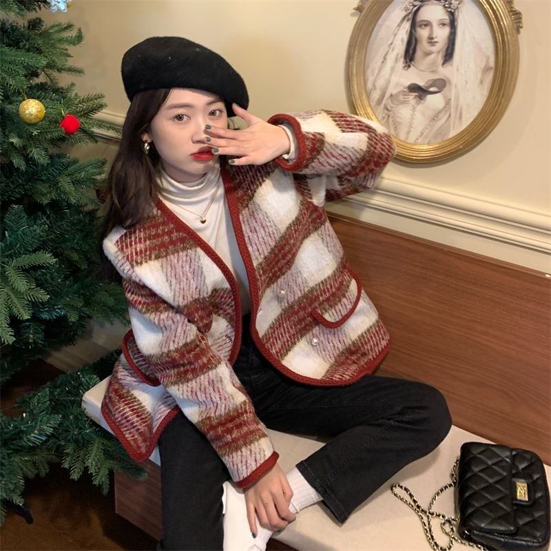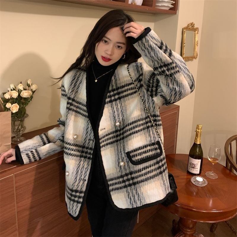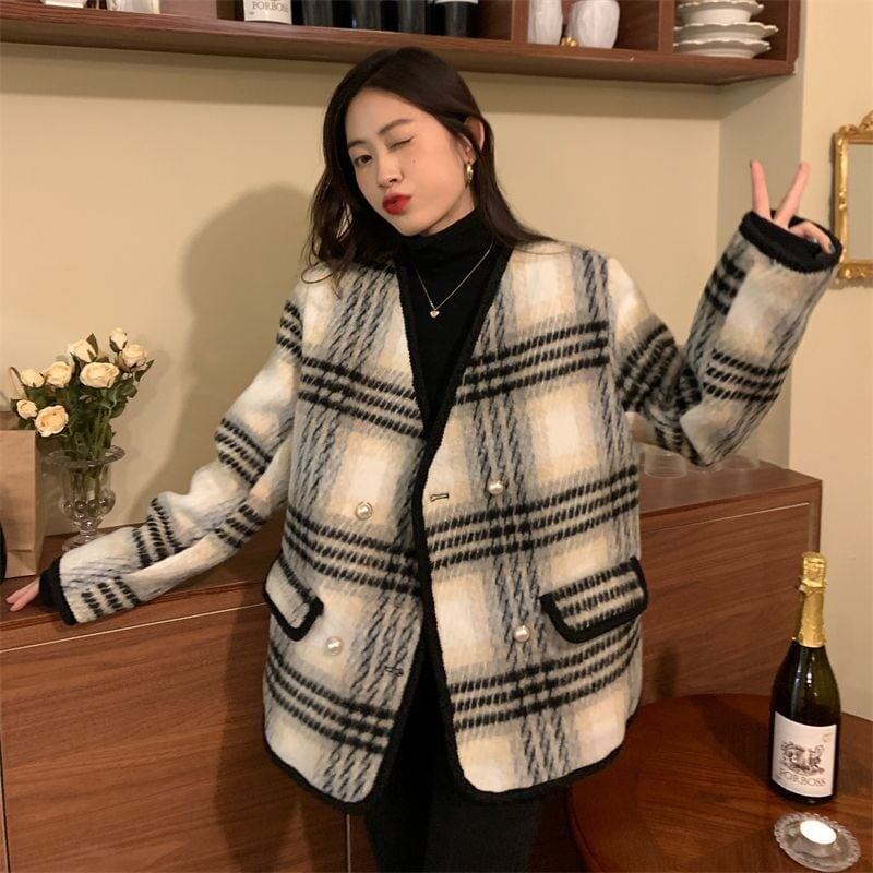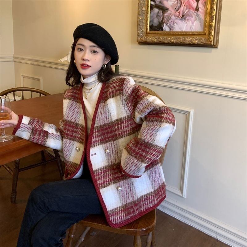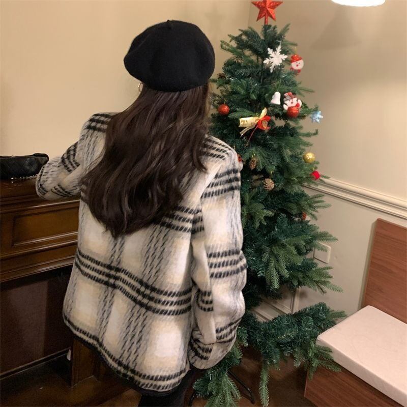 チェック柄 厚手ツイードジャケットトップス2色ありGF3089
