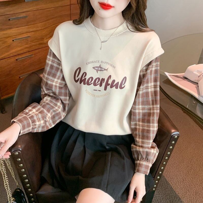 レイヤード風 チェック柄ロゴ スウェットゆったりトップスGF3901