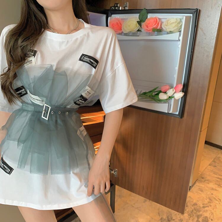 「tops」韓国ファッションラウンドネック半袖偽二つ切り替え着回しTシャツGF4131