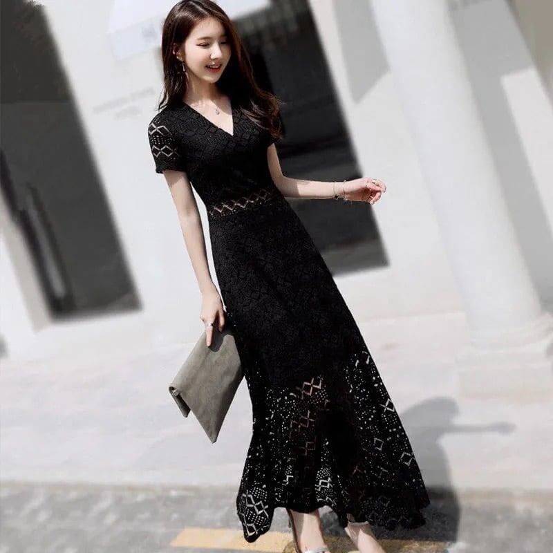 「dress」今季トレンド新作レース着痩せハイウエストAライン透かし彫り無地ワンピースGF4228