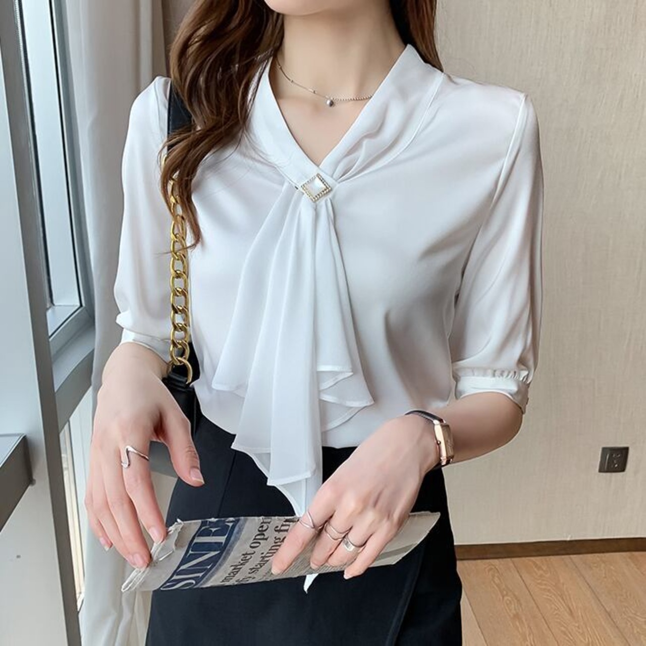 「tops」韓国ファッション2色Vネック半袖無地着回しOL通勤ブラウスGF4285